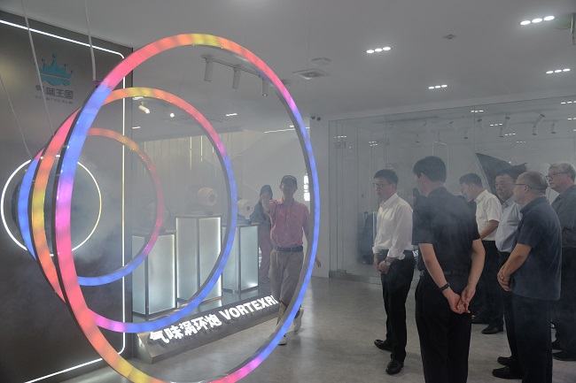 張錦剛一行首先參觀了文三數(shù)字生活街區(qū),在未來感十足的“氣味王國”元宇宙香氛店中,體驗(yàn)算法通過識(shí)別面部表情推薦的“擁有自己身份標(biāo)識(shí)”的定制氣味。在現(xiàn)場,氣味王國創(chuàng)始人 CEO黃劍煒向參觀領(lǐng)導(dǎo)們介紹了現(xiàn)實(shí)香味向數(shù)字香味轉(zhuǎn)化的原理,以及各式各樣香氛原材料收集過程中與甘肅的不解之緣。