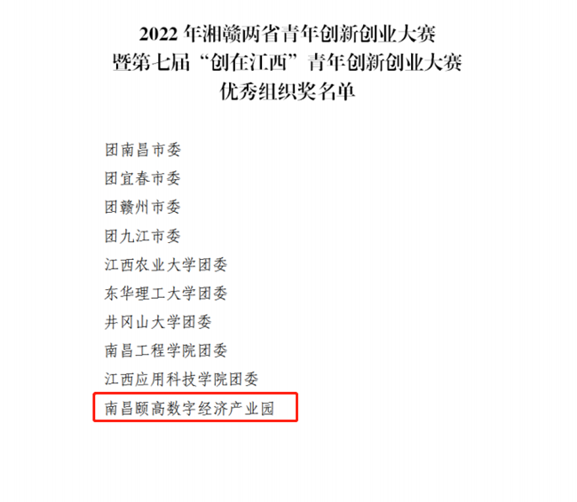 4月11日,2022 年湘贛兩省青年創(chuàng)新創(chuàng)業(yè)大賽暨第七屆“創(chuàng)在江西”青年創(chuàng)新創(chuàng)業(yè)大賽頒獎(jiǎng)儀式在江西萍鄉(xiāng)安源區(qū)舉行。南昌頤高數(shù)字經(jīng)濟(jì)產(chǎn)業(yè)園榮獲大賽“優(yōu)秀組織獎(jiǎng)”稱(chēng)號(hào)。江西省政協(xié)副主席,工商聯(lián)主席謝茹,萍鄉(xiāng)市委副書(shū)記,代市長(zhǎng)熊運(yùn)浪,江西團(tuán)省委書(shū)記邱凌等出席。江西頤高總經(jīng)理陳鵬受邀參加并上臺(tái)領(lǐng)獎(jiǎng)。