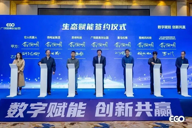 活動現(xiàn)場,為擴大交流、加強合作,促進多方互惠共贏、共謀發(fā)展,舉行了生態(tài)合作賦能簽約儀式。杭州靈伴科技有限公司(Rokid)商務(wù)總監(jiān)張忠龍,杭州易姆訊科技有限公司副總經(jīng)理胡乃權(quán),微電站集團總經(jīng)理姜在茂,山東省鹽堿地植物微生物聯(lián)合修復(fù)工程技術(shù)研究中心高級合伙人羅成,杭州它人機器人技術(shù)有限公司市場總監(jiān)鐘杰娜等多家數(shù)字經(jīng)濟企業(yè)代表與頤高產(chǎn)城科技副總裁翁國明共同簽約,加速廣饒產(chǎn)業(yè)生態(tài)發(fā)展,賦能本地企業(yè)。為建設(shè)資源共享、發(fā)展共促的良好格局提供有力支持保障。