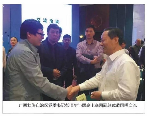 會議結(jié)束之后,頤高代表團(tuán)受到廣西壯族自治區(qū)黨委書記彭清華和廣西壯族自治區(qū)主席陳武的親切接見,頤高集團(tuán)代表團(tuán)代表向彭書記和陳主席匯報(bào)了頤高電商園的詳細(xì)情況以及未來的發(fā)展戰(zhàn)略,希望通過頤高電商園的運(yùn)營能力和電商資源,提升當(dāng)?shù)禺a(chǎn)業(yè)園區(qū)運(yùn)營水平,推動當(dāng)?shù)貍鹘y(tǒng)產(chǎn)業(yè)轉(zhuǎn)型升級。