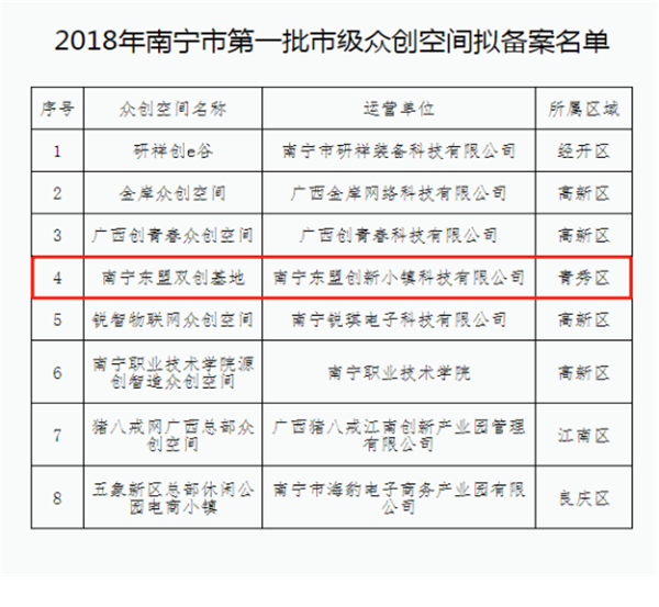 9月28日,根據(jù)《南寧市眾創(chuàng)空間備案認(rèn)定辦法》(南科規(guī)〔2017〕5號(hào))規(guī)定,經(jīng)申報(bào)、專家評(píng)審、現(xiàn)場(chǎng)查驗(yàn)等流程,共有8個(gè)眾創(chuàng)空間為南寧市級(jí)眾創(chuàng)空間并進(jìn)行公示,“南寧東盟雙創(chuàng)基地”成功入選。