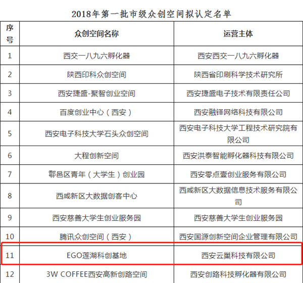 11月7日,根據(jù)《西安市市級眾創(chuàng)空間管理與資助辦法》(市科發(fā)〔2018〕23號)及《西安市科學(xué)技術(shù)局關(guān)于開展2018年第一批市級眾創(chuàng)空間認定工作的通知》,經(jīng)申報、形式審查、評審論證和現(xiàn)場考察等流程,認定頤高蓮湖科創(chuàng)基地等35家眾創(chuàng)空間為2018年第一批市級眾創(chuàng)空間。