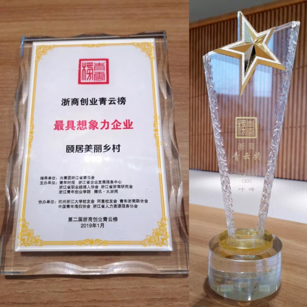 2019年1月15日,星浙商新力量國(guó)際眾創(chuàng)峰會(huì)暨第二屆浙商青云榜頒獎(jiǎng)典禮在杭州召開。本屆青云榜活動(dòng)由共青團(tuán)浙江省委、浙江省經(jīng)信廳、浙江省科技廳、浙江省商務(wù)廳單位指導(dǎo),由青年時(shí)報(bào)、浙江省企業(yè)發(fā)展服務(wù)中心、浙江省職業(yè)經(jīng)理人協(xié)會(huì)、浙江省浙商研究會(huì)、浙江青年創(chuàng)業(yè)學(xué)院、騰訊·大浙網(wǎng)等主辦。歷經(jīng)三個(gè)月層層評(píng)選,頤居美麗鄉(xiāng)村獲評(píng)“最具想象力企業(yè)”,頤居美麗鄉(xiāng)村CEO葉峰榮獲年度浙商青云獎(jiǎng)。