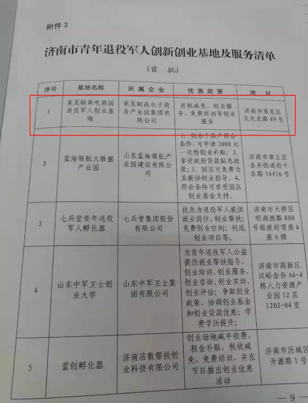 近日,萊蕪頤高電商園獲得濟(jì)南市首批“濟(jì)南市青年退役軍人創(chuàng)新創(chuàng)業(yè)基地”榮譽(yù)稱號(hào),也是萊蕪區(qū)唯一一家獲得該榮譽(yù)稱號(hào)的孵化基地!