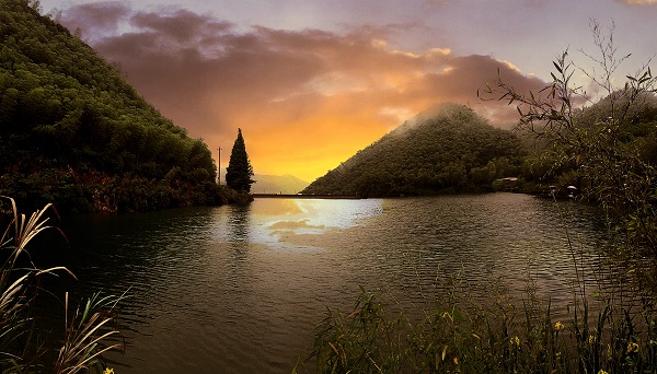 大巴行駛?cè)胗啻?,透過(guò)車窗看天空,云紗霧幔,樹木浩渺,低低的山峰在浮云中若隱若現(xiàn),景色極美。車上的攝影愛(ài)好者早已被余村景色吸引住,下車合影留念后就當(dāng)即開(kāi)始調(diào)試取景。